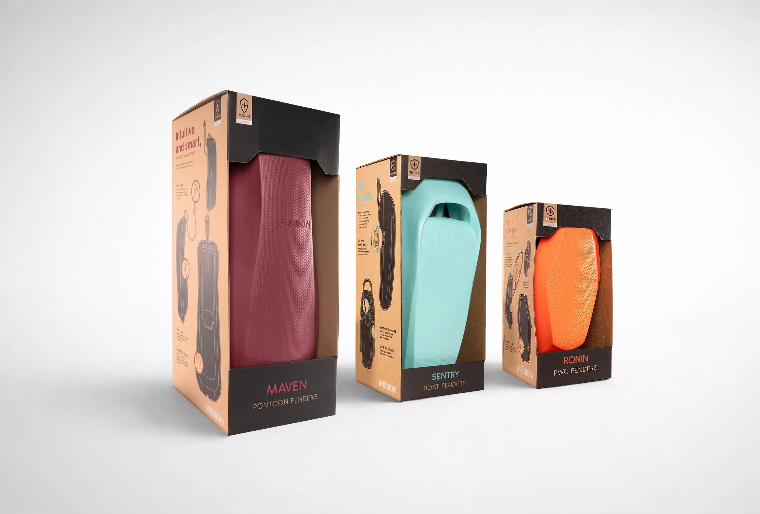 Designed a packaging system for MISSION’s foam fender product line that balanced technical performance messaging with a refined, product-led aesthetic. The packaging highlighted the functional advantages of foam fenders while visually echoing the design and quality of the product itself—positioning the fenders as both a smart and beautifully engineered solution.